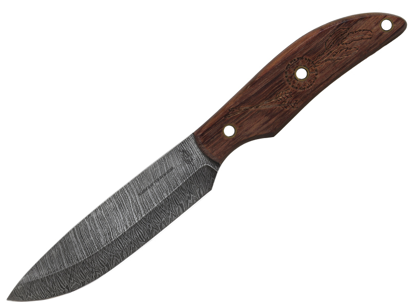 Terra Incognita Finlay ведет свою родословную от ножа, известного как Nessmuk, авторства легендарного североамериканского путешественника Джорджа Сирса. Этот незаурядный человек, популяризатор туризма, и сторонник охраны природы, автор многих книг и статей на тему своего увлечения, жил во второй половине XIX века, но его наследие живо и сейчас. Книги переиздаются, а нож, придуманный Сирсом, находит воплощение во множестве современных ножей, начиная с легендарного Canadian Belt Knife. Но изначально Nessmuk это детище Сирса, его представление об идеальном походном ноже. Широкий клинок с понижение линии обуха имеет длинное и протяженное лезвие. Проникающая способность острия средняя – в этом ноже упор сделан на режущие свойства. Если обратить внимание на рукоять, то можно увидеть, что вместо ограничителя, препятствующего соскальзыванию ладони на режущую кромку, у этого ножа глубокий подпальцевый радиус. Это необходимо для четкого и уверенно контролируемого реза. Изготовлен клинок из дамасской стали. Сварочный дамаск получают в процессе многократной перековки стального пакета, который состоит из стальных полос с различным содержанием углерода, т. е. низкоуглеродистых — более гибких, но мягких, и высокоуглеродистых — более твердых, но ломких. Таким образом, получается материал, сочетающий в себе сильные стороны разных сталей. Дамаск Finlay отличается высокой твердостью вкупе с хорошей ударной вязкостью, а значит, он отлично держит режущую кромку и при этом эффективно противостоит нагрузкам. Между тем стоит понимать, что этот дамаск не обладает нержавеющими свойствами, а значит, клинок Finlay требователен к уходу. Сопряжение клинка и рукояти пластинчатое – это надежный и долговечный способ монтажа, как раз то, что нужно для туристического ножа. Накладки рукояти из древесины палисандра закреплены латунными заклепками. Древесина палисандра – древесина деревьев рода дальбергия, родом из Южной Америки. Цвет: от розовато-коричневого до кирпично-красного или даже шоколадно-бурого с красивым рисунком. По твердости превосходит дуб в полтора-два раза. Хорошо полируется. Из палисандра получаются красивые, твердые и износостойкие рукояти, с эффектом «теплоты» и приятными тактильными ощущениями. Как и каждая древесина, палисандр боится влаги, огня и уязвим перед грибком. В рисунке на рукояти использованы индейские мотивы, напоминающие об истории этого неординарного ножа. Ножны Terra Incognita Finlay сшиты из натуральной кожи. Terra Incognita Finlay – нож, способный украсить любую коллекцию, и в тоже время стать верным спутником в любом походе.